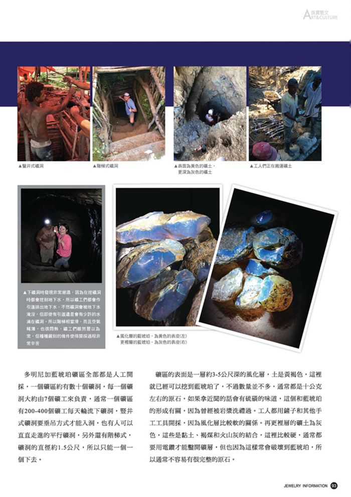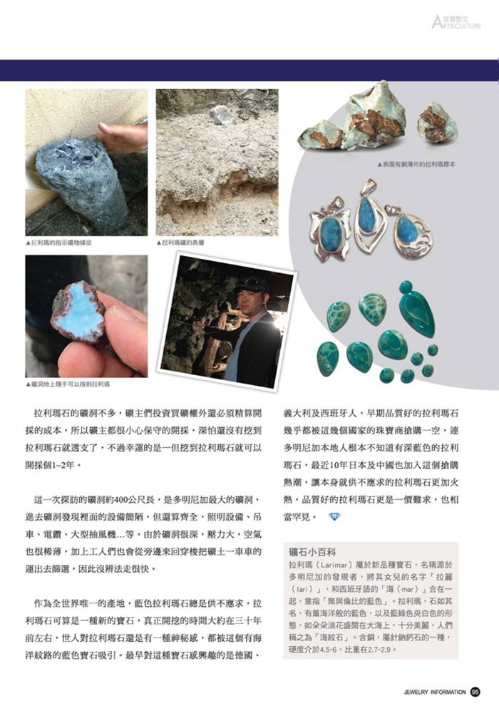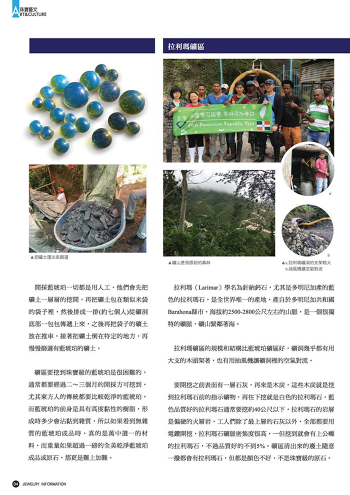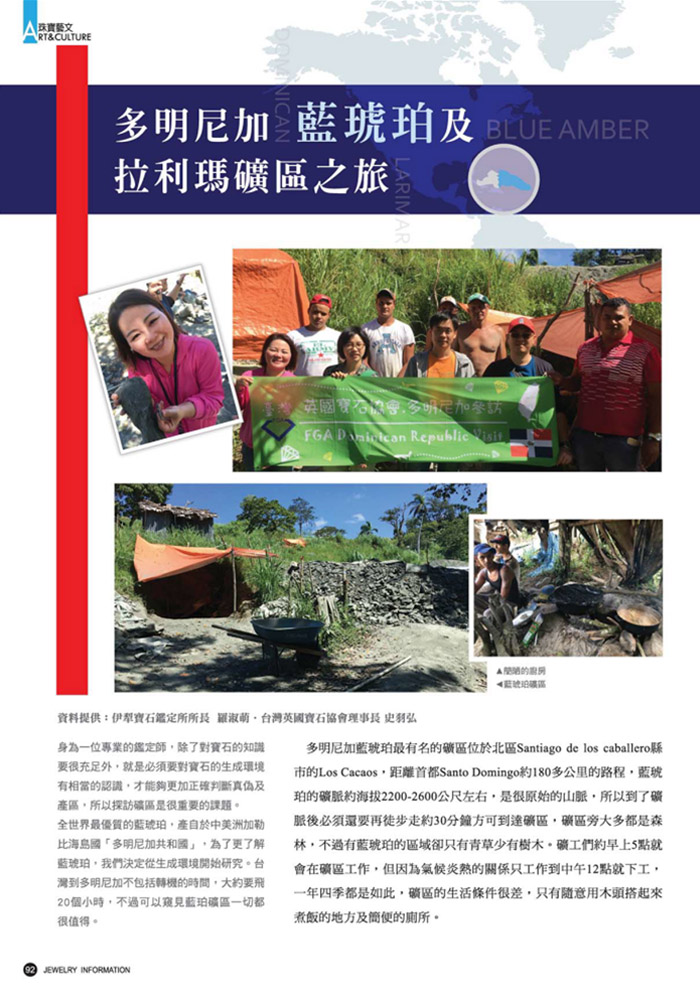 第67期 多明尼加藍琥珀及拉利瑪礦區之旅 3 月 4, 2024 | 尚無留言 多明尼加藍琥珀及拉利瑪礦區之旅,多明尼加藍琥珀礦區全部都是人工開採,一個礦區約有數十個礦洞,每一礦洞大約由7個礦工來負責 Categories: 珠寶雜誌專刊